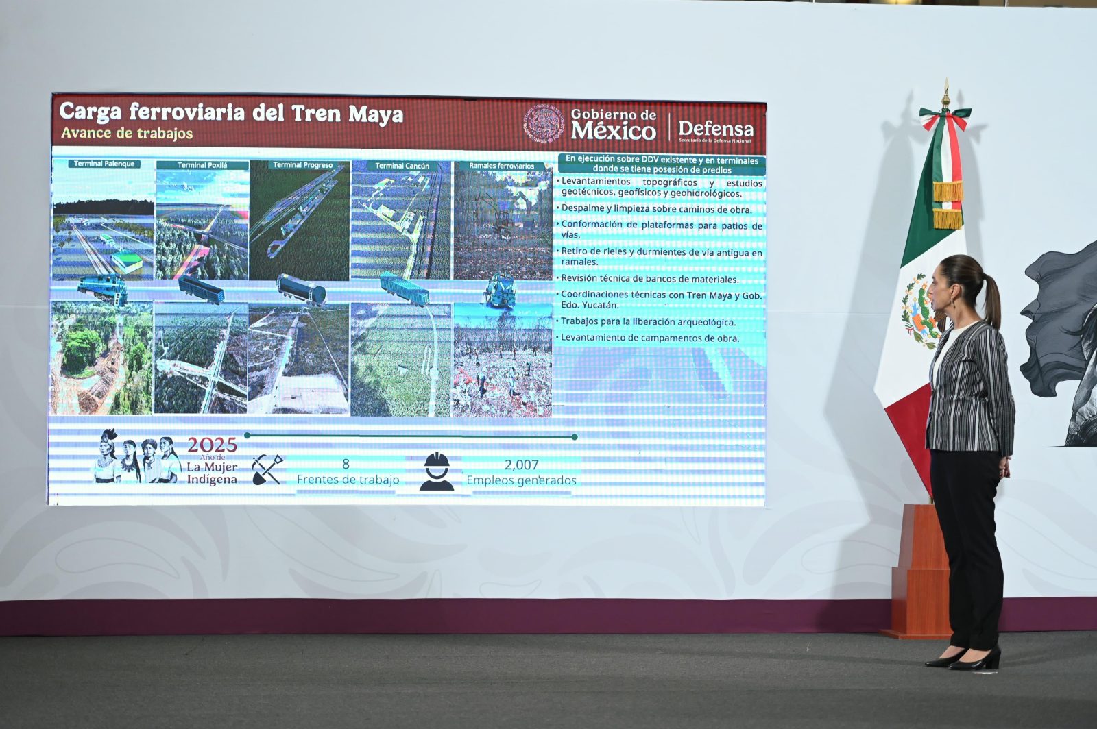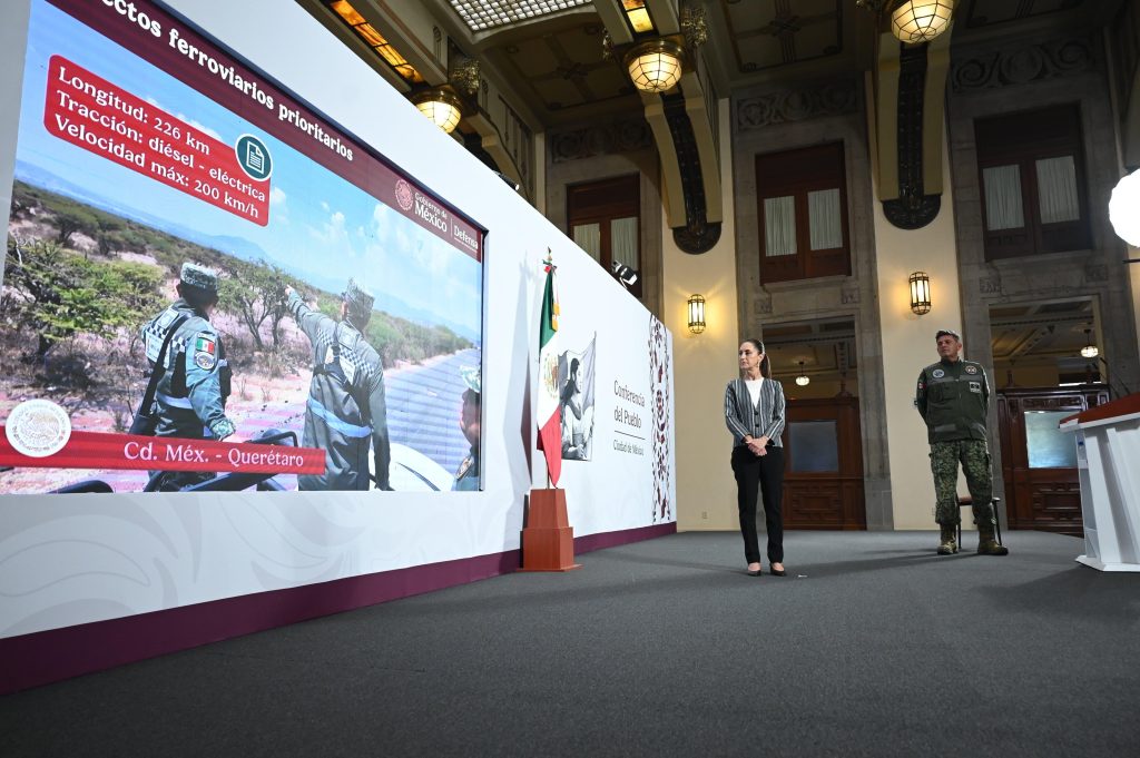Ciudad de México, 21 de mayo de 2025.- La Presidenta Claudia Sheinbaum Pardo destacó que a siete meses de su gobierno la inversión pública se ha traducido en obras como las nuevas rutas de trenes de pasajeros AIFA-Pachuca, Ciudad de México-Querétaro, así como la vía de carga del Tren Maya, cuya construcción están a cargo del agrupamiento de ingenieros militares “Felipe Ángeles” de la Secretaría de la Defensa Nacional. Mientras que los tramos Querétaro-Irapuato y Saltillo-Nuevo Laredo ya fueron licitados.