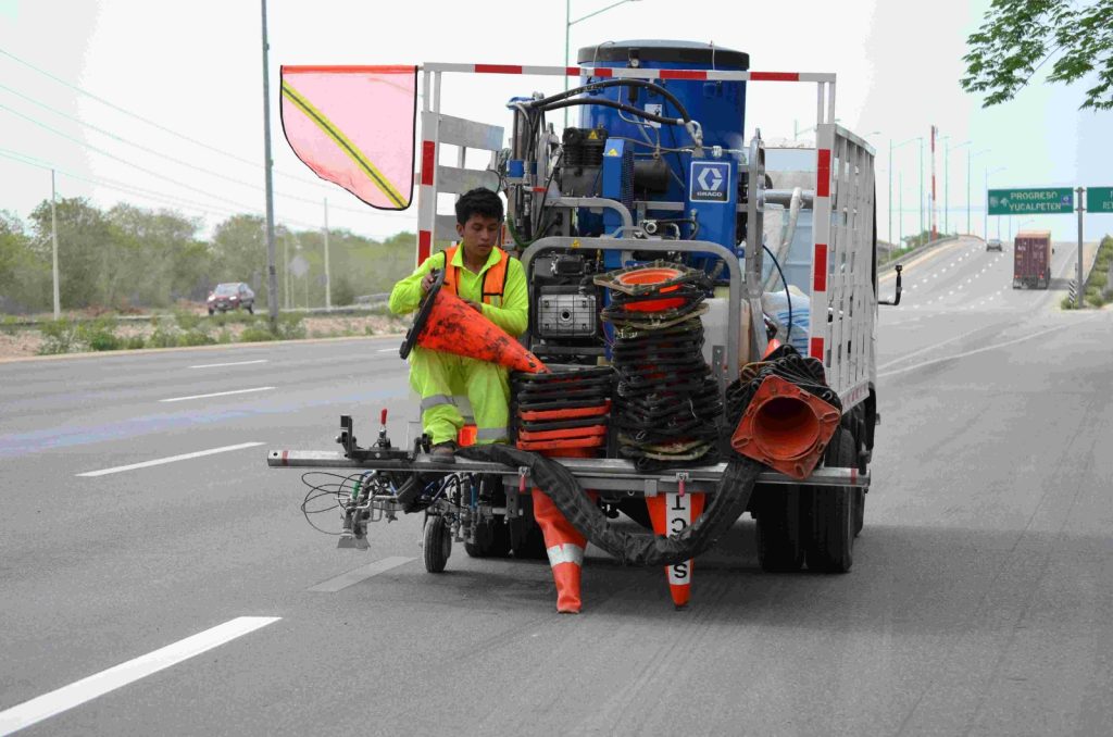Como parte de las acciones del programa anual de conservación de carreteras, la Secretaría de Infraestructura, Comunicaciones y Transportes (SICT) en Yucatán, inició las labores de la instalación de señalamiento horizontal con pintura de alto desempeño y elementos reflectivos.