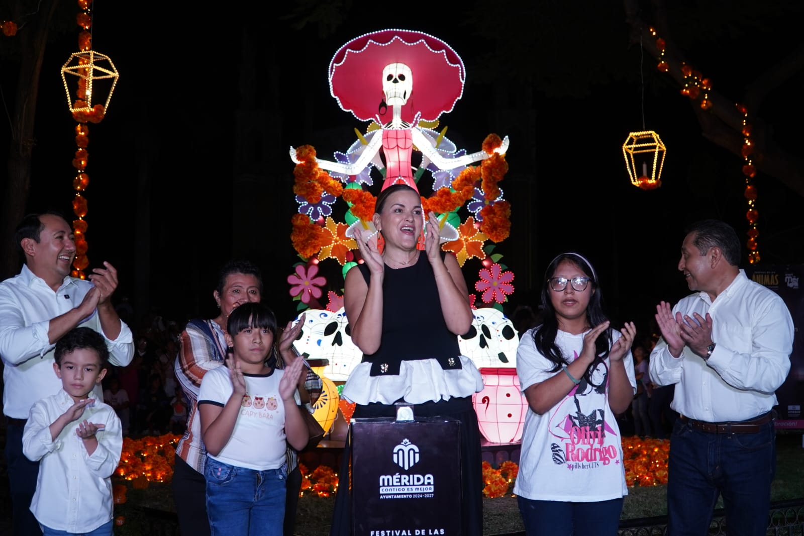 Mérida, Yucatán, sábado 25 de octubre de 2025.– Con la asistencia de más de 5 mil personas, la presidenta municipal Cecilia Patrón Laviada inauguró el Festival de las Ánimas 2025, un evento que une tradición, arte y convivencia, con la iluminación de 14 figuras monumentales instaladas en el Parque de San Juan.